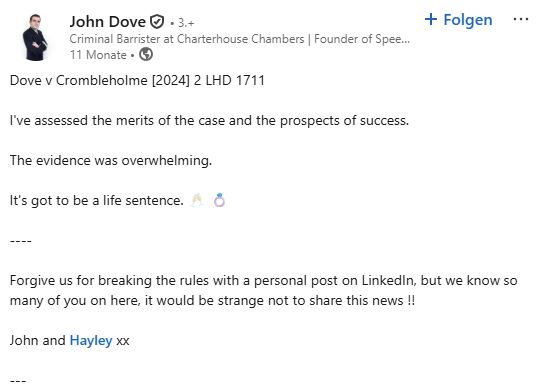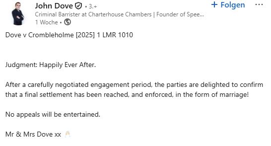 Im Verfahren zwischen Hayley Crombleholme - Fachanwältin für Immobilienrecht – und dem Strafverteidiger John Dove ist ein folgenschwerer Vergleich geschlossen worden. „Nach einer sorgfältig verhandelten Verlobungsphase verkünden die Parteien mit Vergnügen, dass eine Einigung erzielt, und in der Form einer Heirat vollzogen wurde“, so Dove in einem LinkedIn-Post mit feierlichen Bildern seiner Hochzeit. Und natürlich mit Aktenzeichen (Dove v Crombleholme – [2025] 1 LMR 1010):